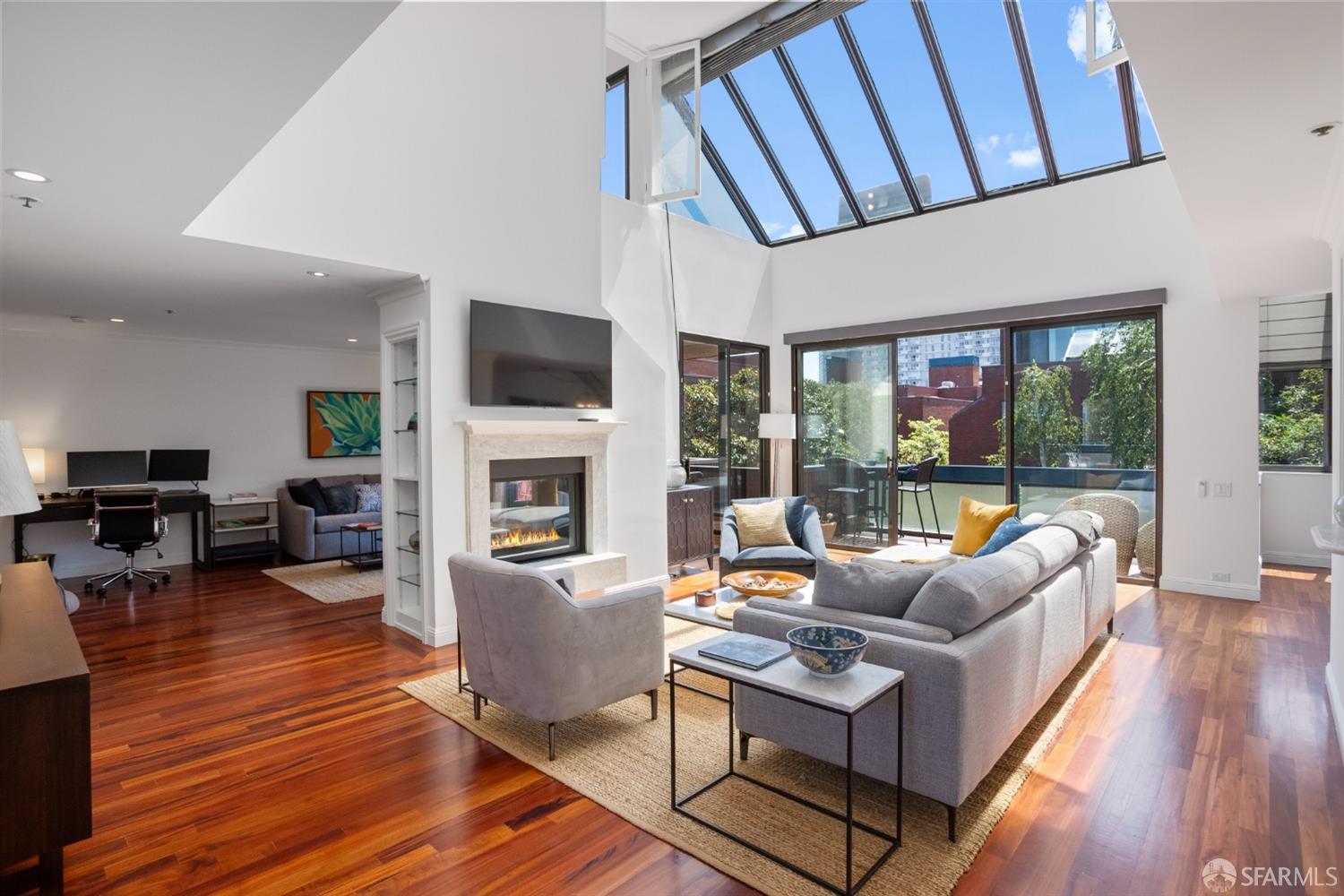 Golden Gateway Commons offers spacious 2-bedroom and 3-bedroom townhouse-style condominiums ranging from approximately 914 to 2,295 square feet of living space. These light-filled residences showcase floor-to-ceiling windows, hardwood floors throughout, wood-burning fireplaces, private outdoor patios or balconies, in-unit washer/dryer, skylights in select units, high ceilings (some units feature soaring 17-foot greenhouse skylights), and deeded parking spaces in secured garages.