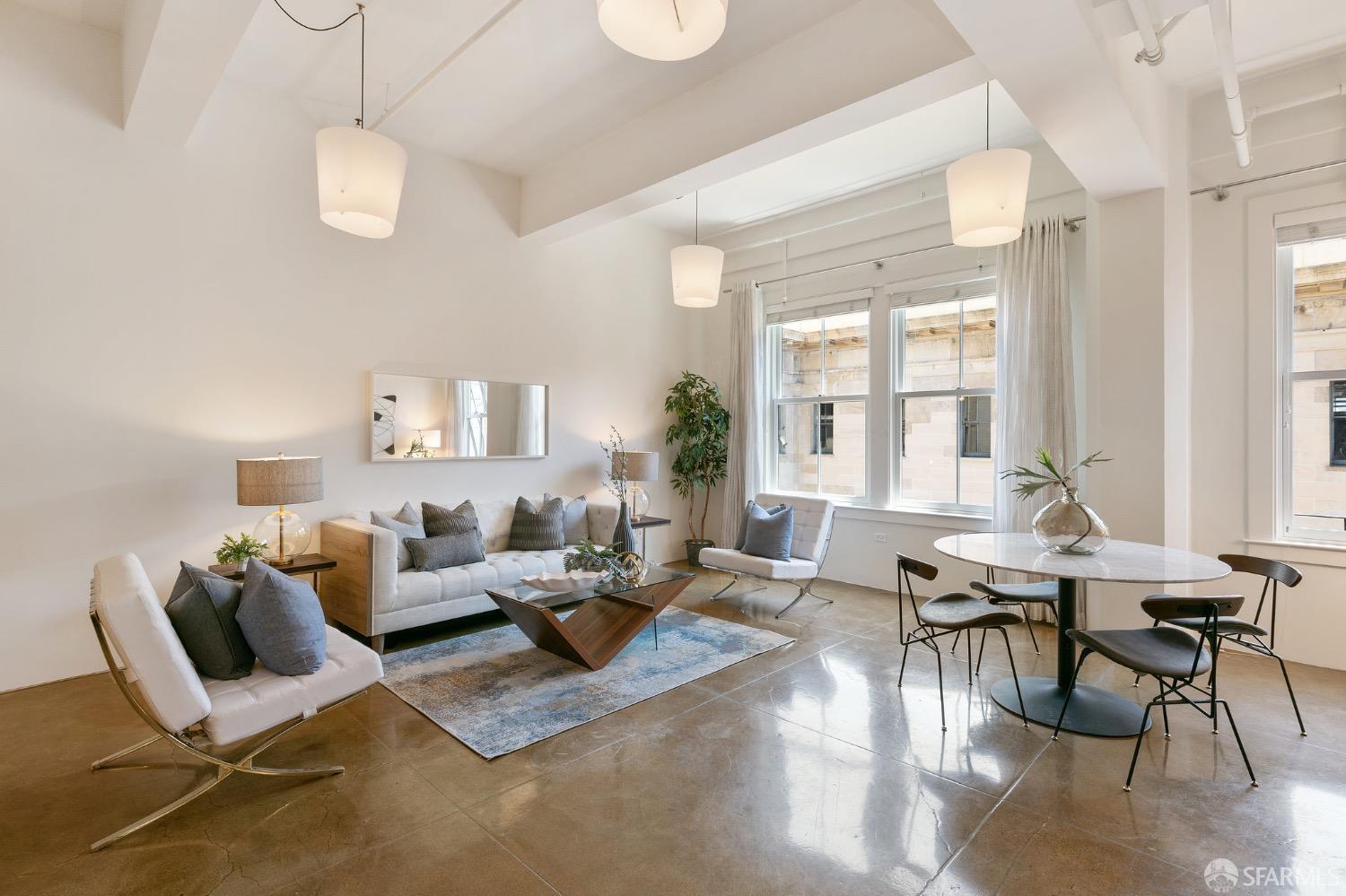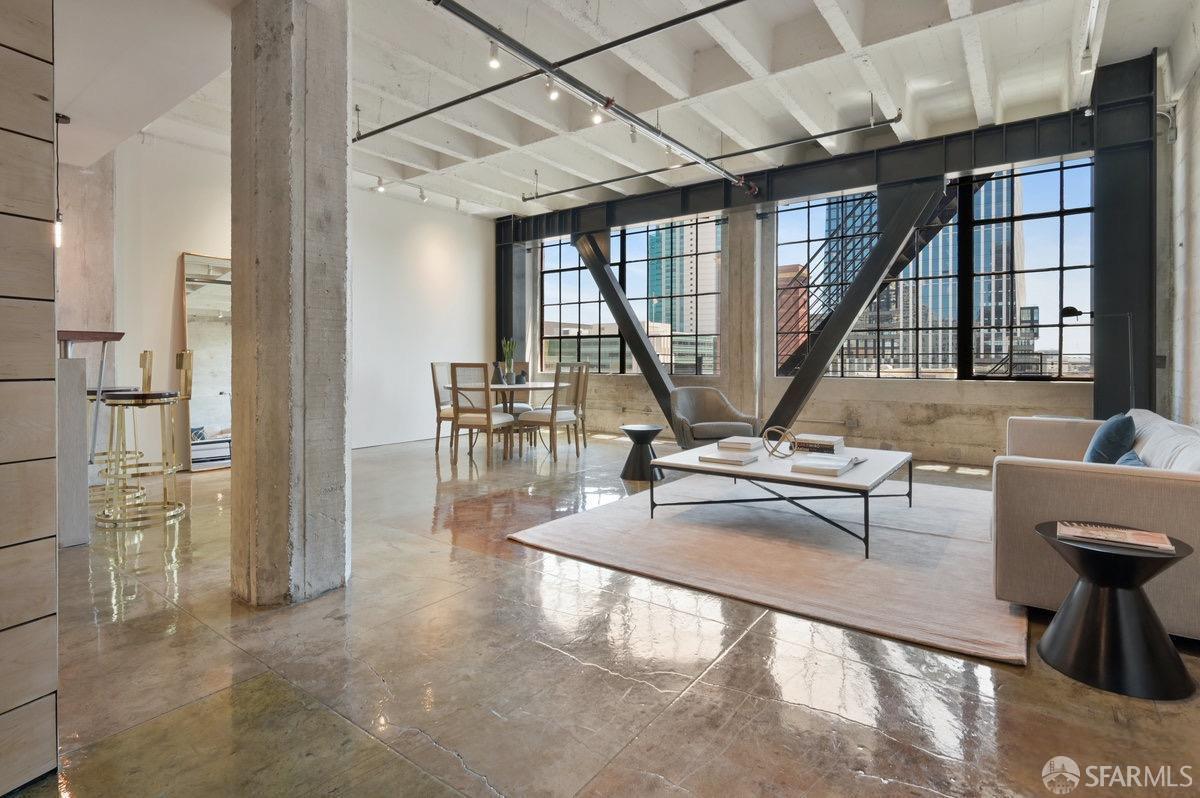 Mint Collection residences offer authentic loft-style living with expansive open floor plans, soaring 11'6" ceilings, and dramatic oversized industrial double-hung windows providing abundant natural light and downtown San Francisco views. Interiors feature exposed concrete and plaster wall finishes, acid-stained polished concrete floors, custom wood and glass sliding wall panels, and high-end contemporary details throughout.